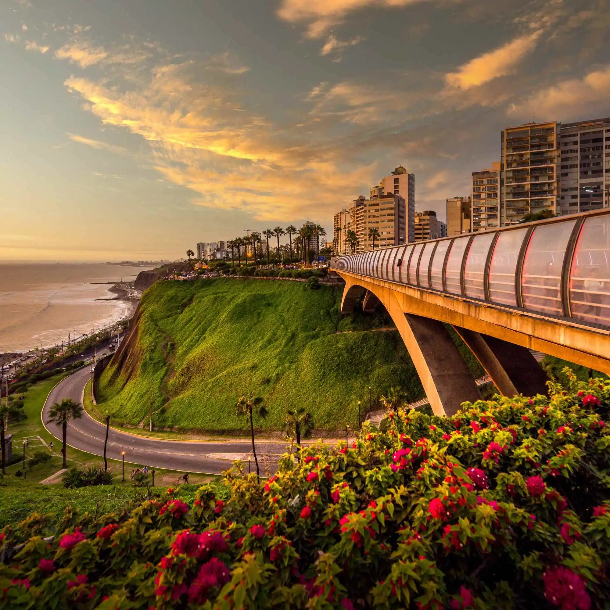Nuestra primera parada será en el icónico Parque del Amor, ubicado frente a los majestuosos acantilados del Malecón de Miraflores. Desde aquí, podrás contemplar una vista panorámica del Océano Pacífico y apreciar la escultura del "El Beso", símbolo del romanticismo limeño y punto de encuentro de viajeros y locales.